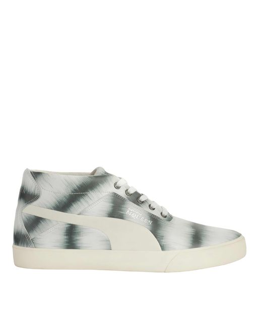Fashion house Alexander McQueen has connected with the athletic apparel and sneaker brand Puma for a release of their Autumn/Winter 2012 collection. The line includes 7 ranges of low, mid and high top sneakers in a variety of designs such as ikat bleeding stripes to chocolate. Each shoe is premium leather with soft pigskin leather lining.
