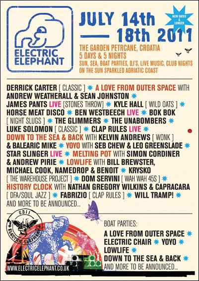 The 2011 Electric Elephant Festival is geared up once again but with this year’s happenings occuring in July with a five day/night expansion. Set for July 14-18, the festival which takes place in Croatia, has a massive line up this year including acts such as Derrick Carter, Detroit wonderkid Kyle Hall, Ben Westbeech, Wah Wah 45’s Dom Servini, Bok Bok and tons more. This is an event to surely plan for.