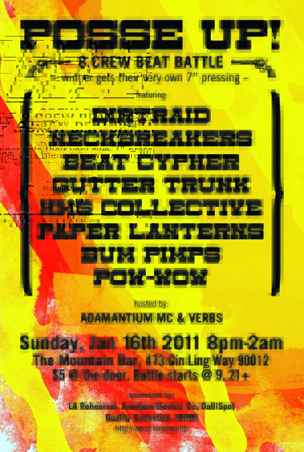 The Posse Up beat battle will take place on Jan. 16, 2011 at The Moutain Bar in the city of Los Angeles, CA. Crews will include Dirtraid, Neckbreakers, Beat Cypher, Gutter Trunk, HMS Collective, Paper Lanterns, Bum Pimps and Pow Wow. The winner will get their own 7″ vinyl pressing.